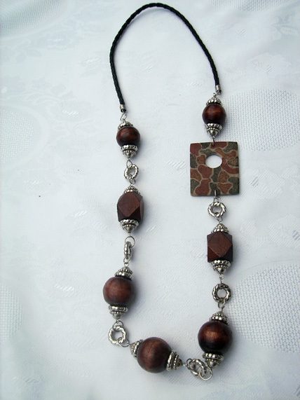 Ogrlica od drva i školjki. Šaljemo je u ukrasnoj organza vrećici.