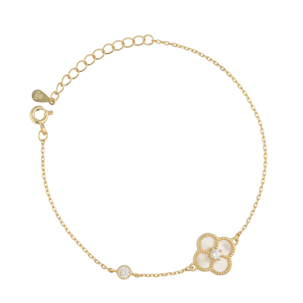 Srebrna narukvica djetelina – clover sa sedefom, cirkonima i 14 karatnom pozlatom