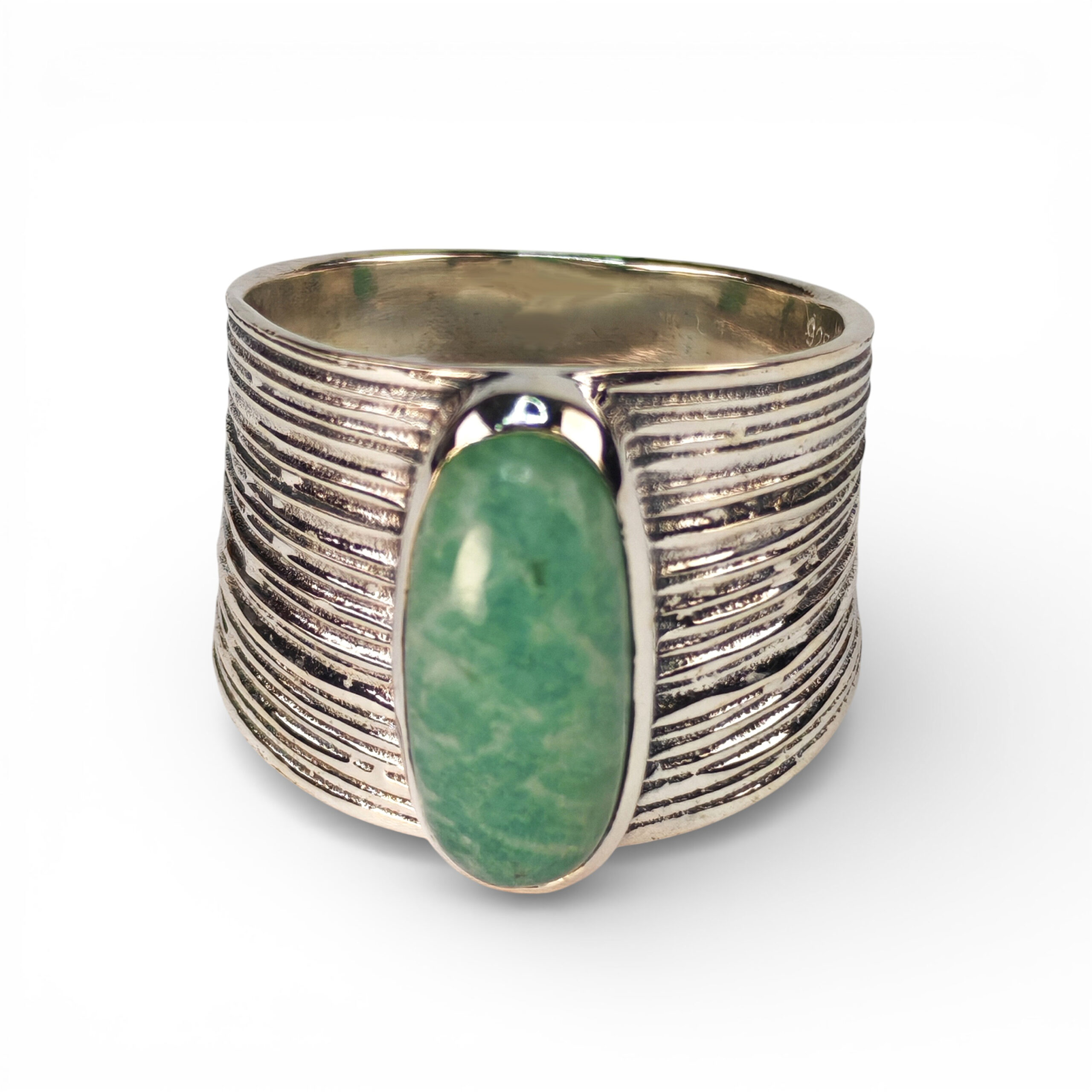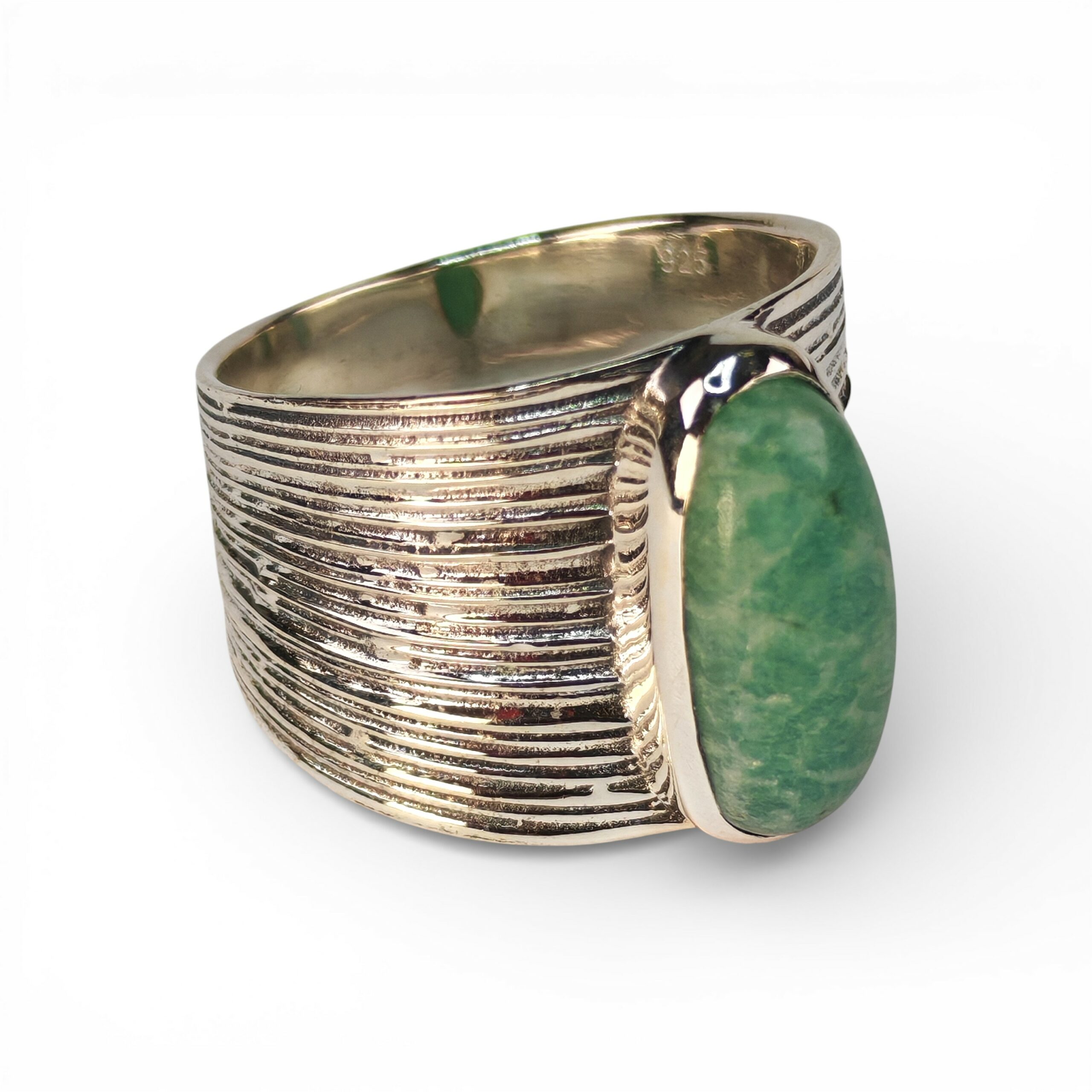 Moćan i upečatljiv srebrni prsten sa širokim, valovitim profilom i velikim centralnim amazonitom. Njegov odvažan skulpturalni dizajn i osvježavajuća boja kamena čine ga vrhunskim statement komadom koji slavi snagu prirode i modernu eleganciju.