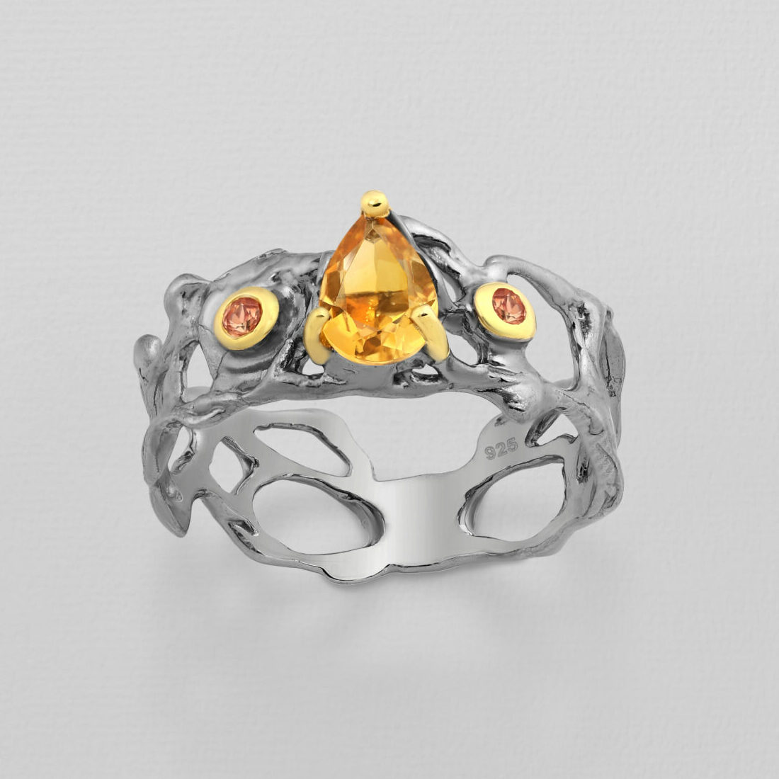 Srebrni prsten izrađen od srebra 925, presvučen sa sivim rutenijumom i 3 mikrona debelim 22 karatnim zlatom. Ukrašen sa citrinom i narančastim safirima