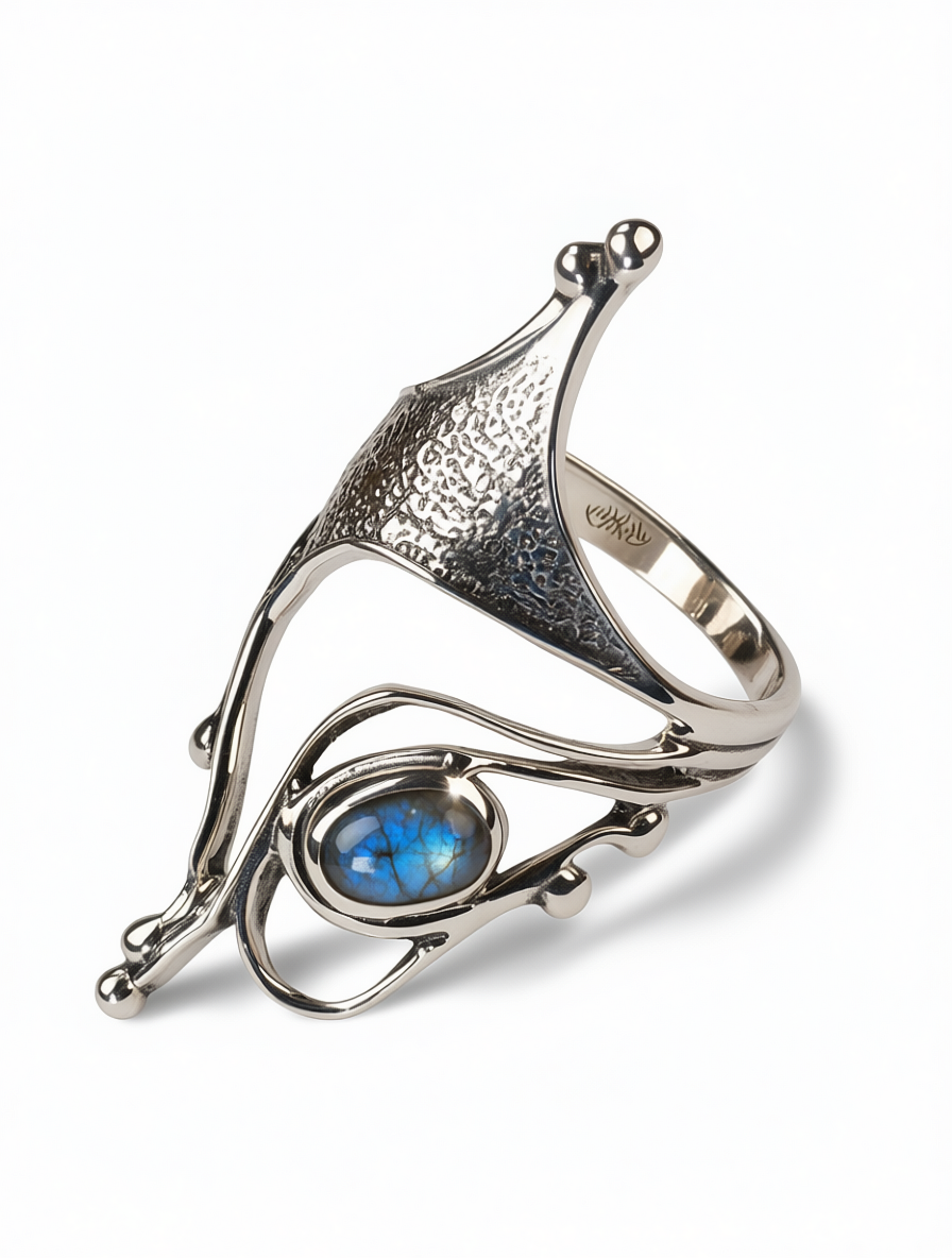 Elegantni srebrni prsten s prirodnim labradoritom, oblikovan u neobičnom, vilinskom stilu. Kombinacija teksturiranih i glatkih linija te intenzivno plavog kamena čini ga izražajnim, umjetničkim komadom nakita koji odmah privlači pažnju.