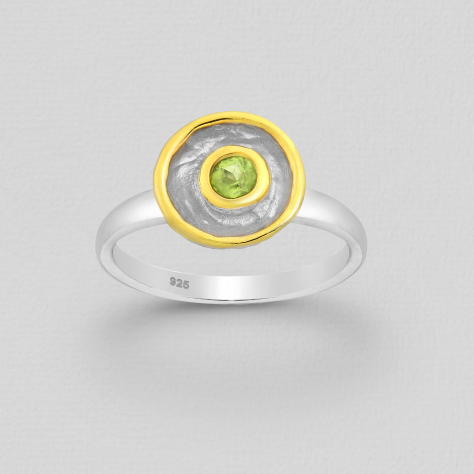 Srebrni prsten izrađen od srebra 925, presvučen sa bijelim rodijem i 3 mikrona debelim 22 karatnim zlatom. Ukrašen sa peridotom