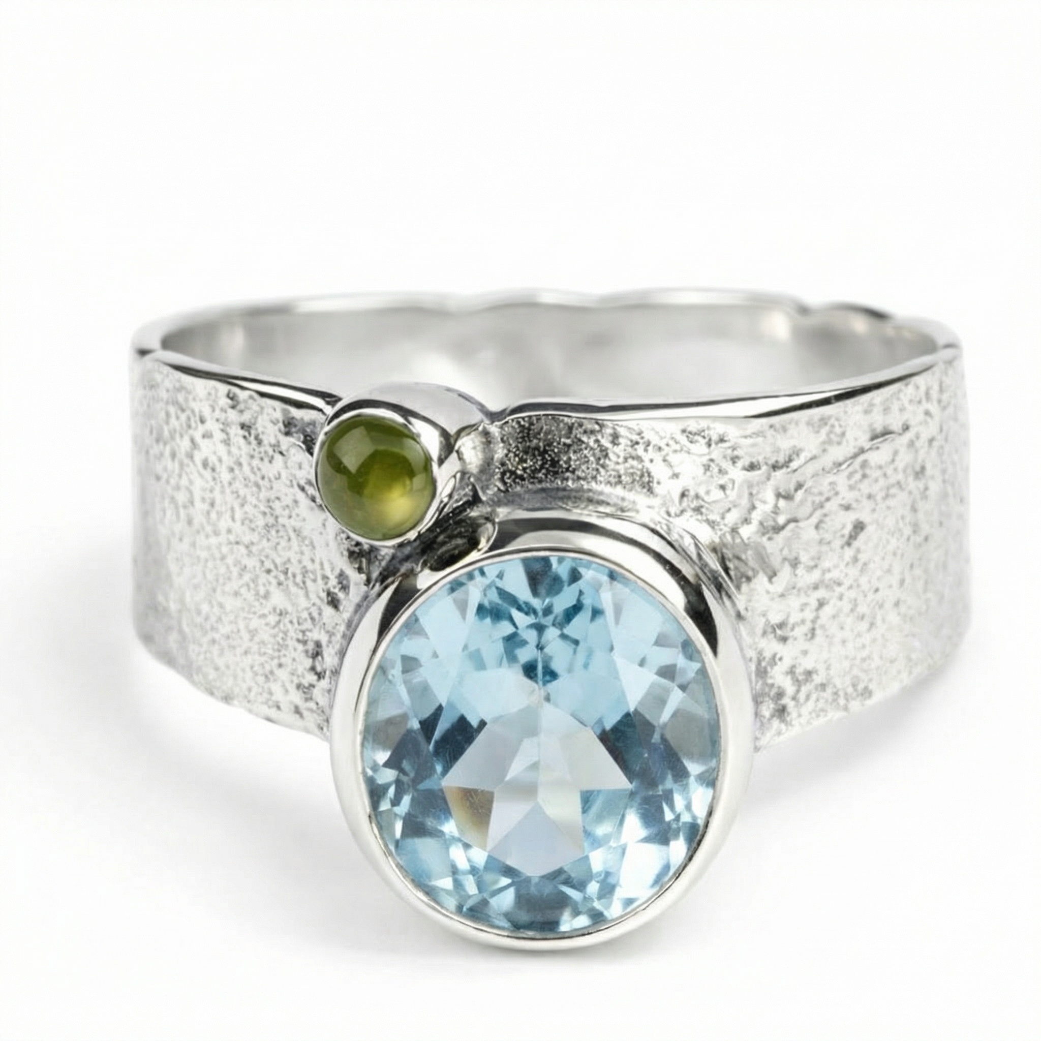 Raskošan srebrni prsten sa širokim, valovitim profilom koji udomljuje veliki nebesko-plavi akvamarin i vibrantni zeleni peridot. Ovaj statement komad nakita spaja snagu masivnog srebra s nježnom elegancijom prirodnih boja, čineći ga idealnim izborom za upečatljiv i svjež izgled.